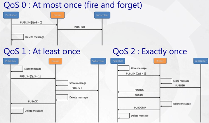 "只有一次", 确保消息到达一次。在一些要求比较严格的计费系统中,可以使用此级别。在计费系统中,消息重复或丢失会导致不正确的结果。这种最高质量的消息发布服务还可以用于即时通讯类的APP的推送,确保用户收到且只会收到一次。 QoS Level 2
